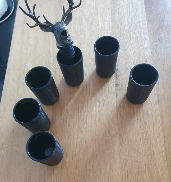 Original Jägermeister 6 steklenih kozarčkov, ki so od zunaj mat črne barve, debelo steklo za v skrinjo.