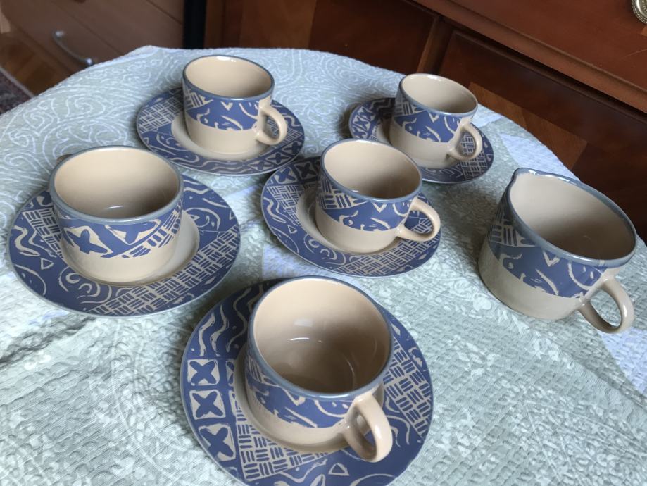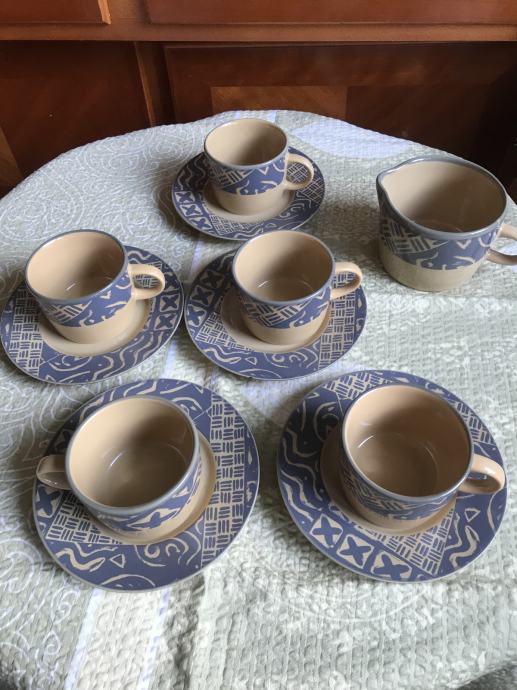 Prodam zanimiv kavni servis narejen na Tajskem (Thailand). Imam pet skodelic, pet krožničkov in vrček. Material je nekje vmes med porcelanom in keramiko. Interesantna je tudi barva in poslikava. Malo drugačno kot smo navajeni.