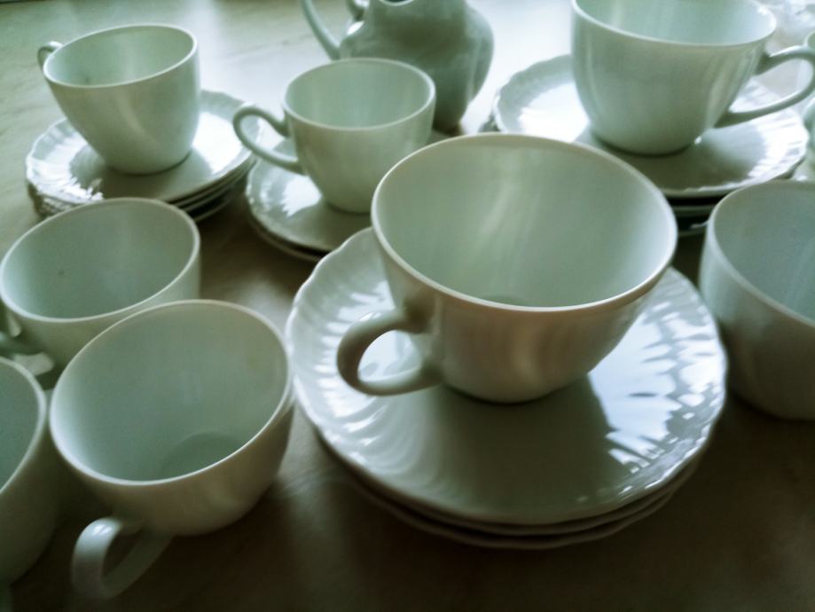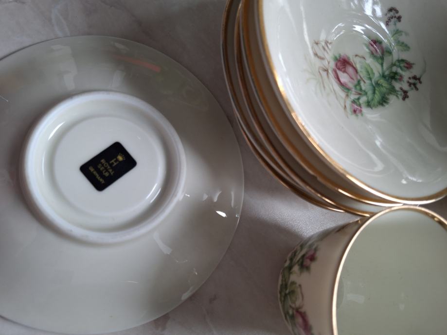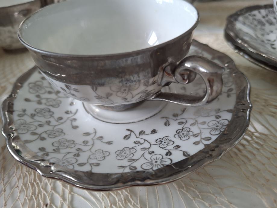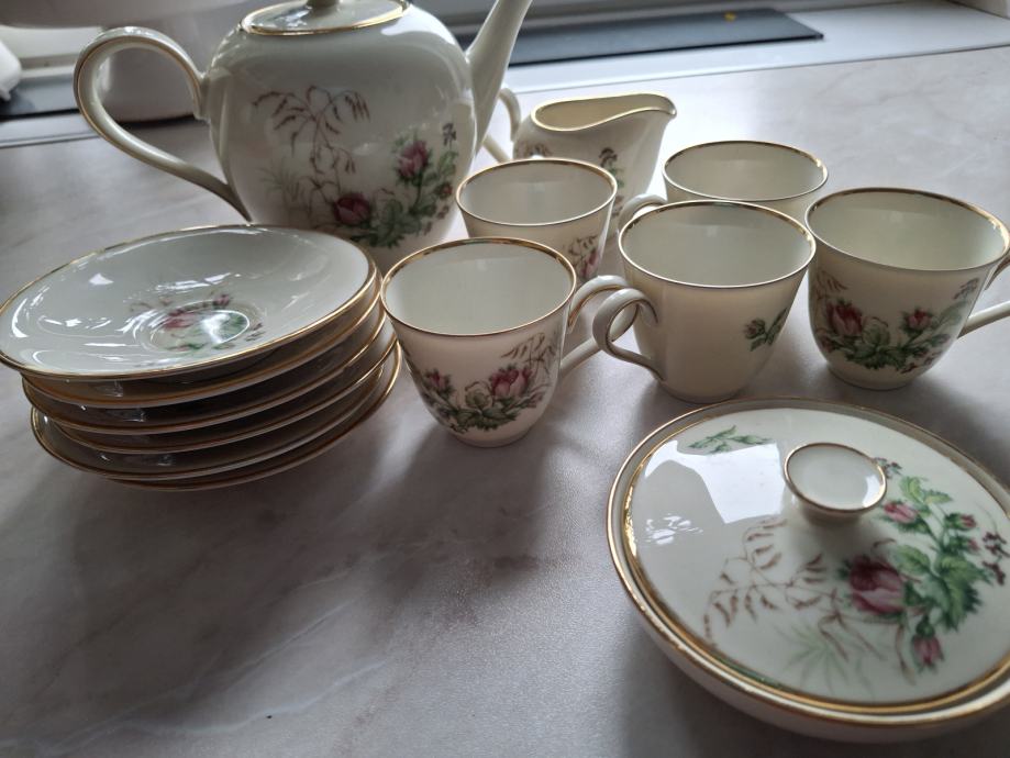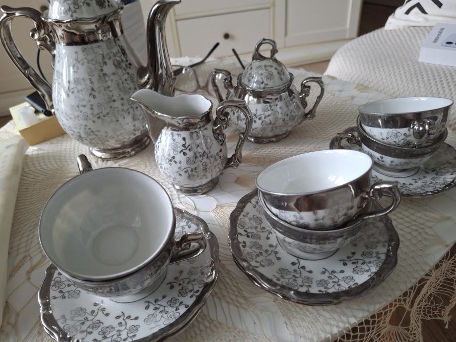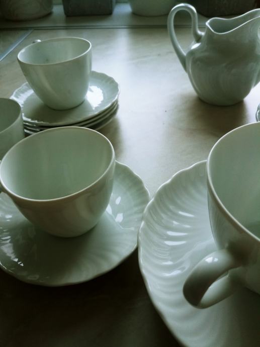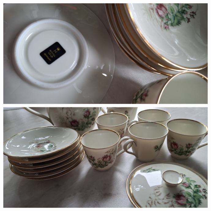 Iz finega porcelana za črno in belo kavo 60 eur, keramični komplet za kavo in čaj ali belo kavo 25 eur. V kompletu je še večji krožnik, sladkornica in skledica in Bavarja porcelanast komplet za črno kavo, manjka 1 krožniček 80 eur in porcelanast servis za kavo Royal selb Germany, manjka ena skodelica 60 eur.