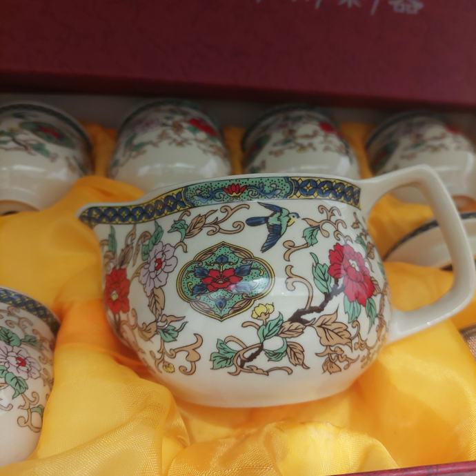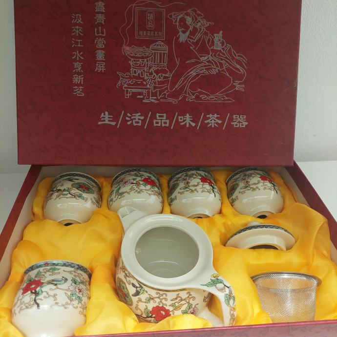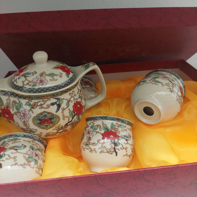 Prodam komplet kot je viden na sliki sestavljen iz čajnika s cedilom in pokrovom in 5 kom šalčk.