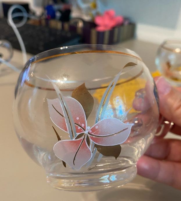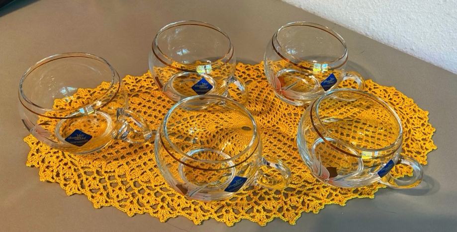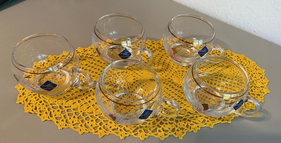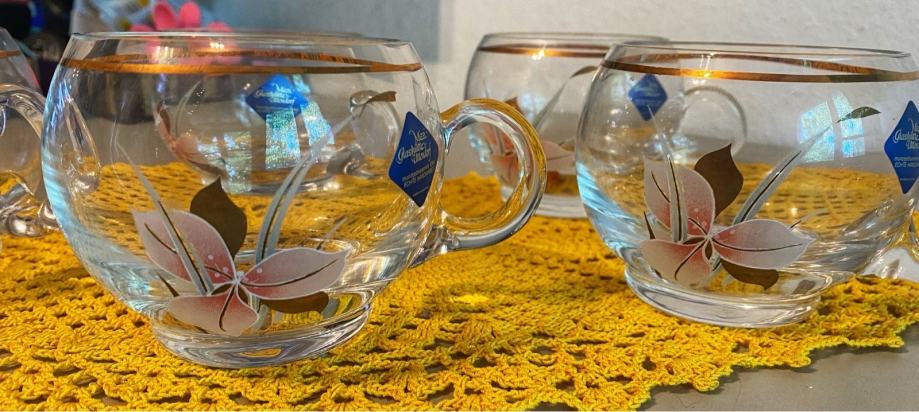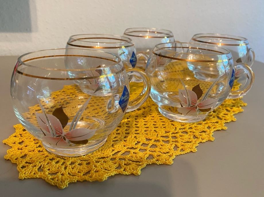 Komplet vintage, pihani, stekleni in ročno poslikani kozarčki. Komplet jih vsebuje 5, saj je zadnji malenkost oškrbljen na zgornjem robu - zadnja slika - in ga kupcu podarim. Pošljem tudi po pošti.