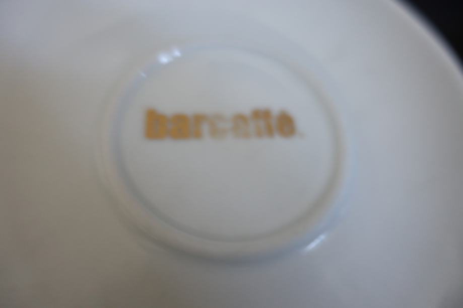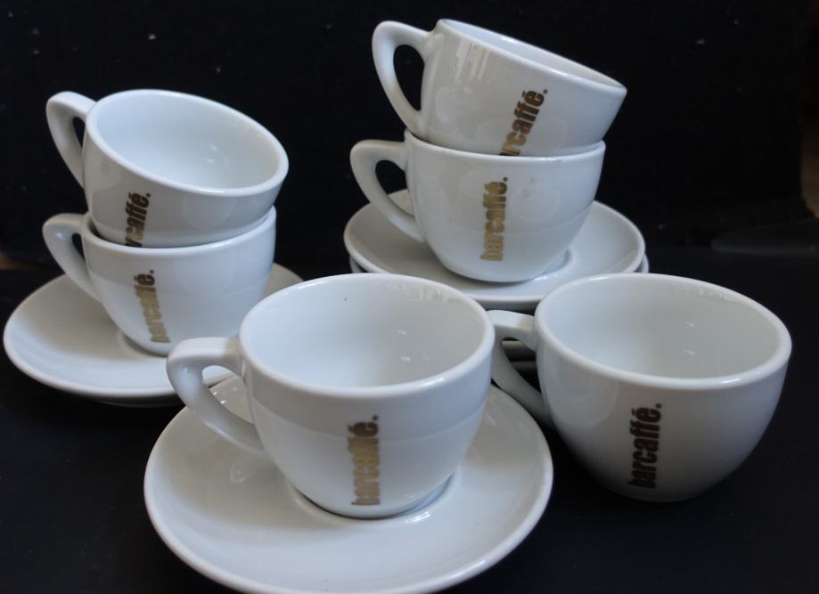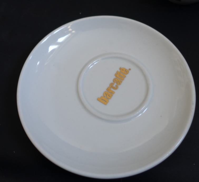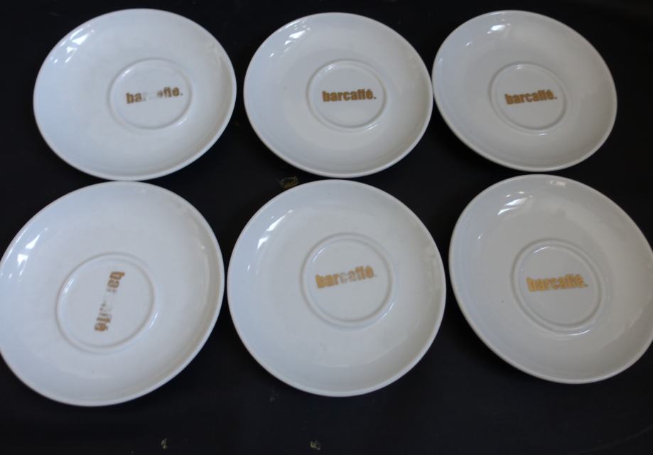 Skodelice brezhibne, trije od krožničkov pa imajo na sredini delno odstranjeni dve črki v napisu Barcaffe