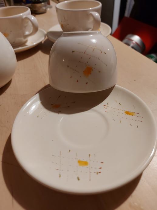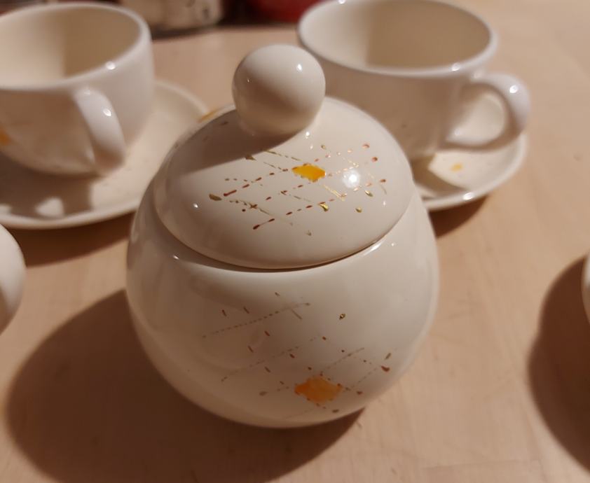 Na voljo je komplet za kavico iz glazirane keramike, v barvi vanilije in ročno poslikan. Odlikuje ga zelo lepa oblika in nežnost poslikave. Set vsebuje:
