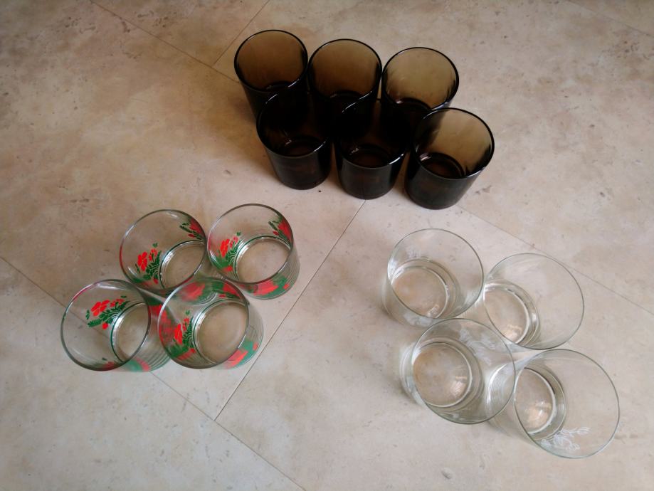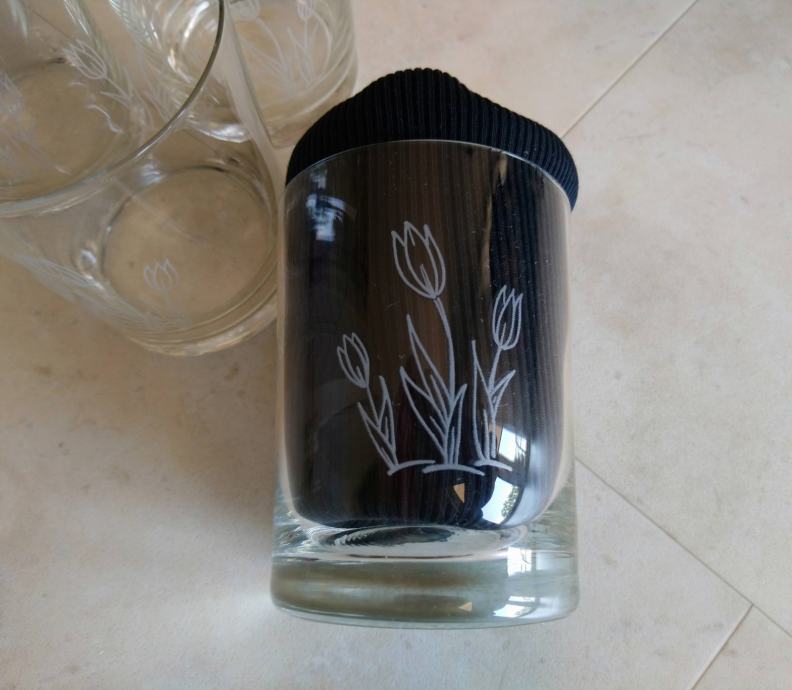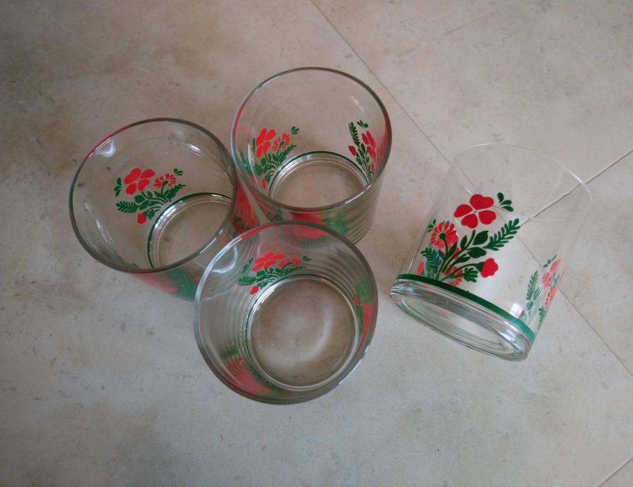 Komplet 4 kozarcev s tulipani. Velikost premer 7,5 cm, višina 9 cm. Fino steklo. Cena 3 €.