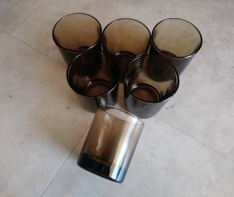 Nov komplet 6 kozarcev v rjavi barvi. Velikost premer 7 cm, višina 8 cm. Cena 5 €.