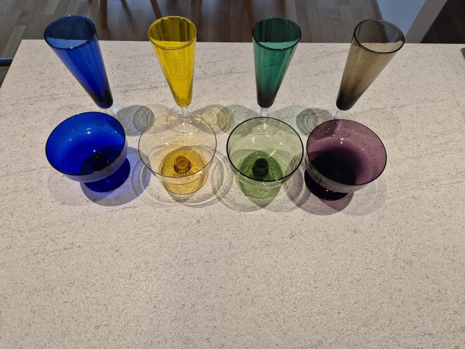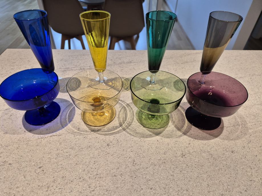 Prodam 4 barvaste steklene kozarce za penino in 4 steklene kozarce za koktajl, ki so lahko tudi skodelice.