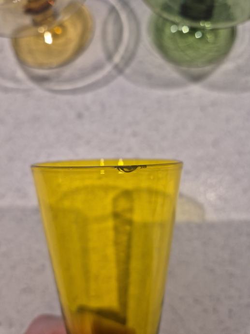 Rumen kozarec za penino je na robu malce odškrtnjen, kot je vidno na sliki.