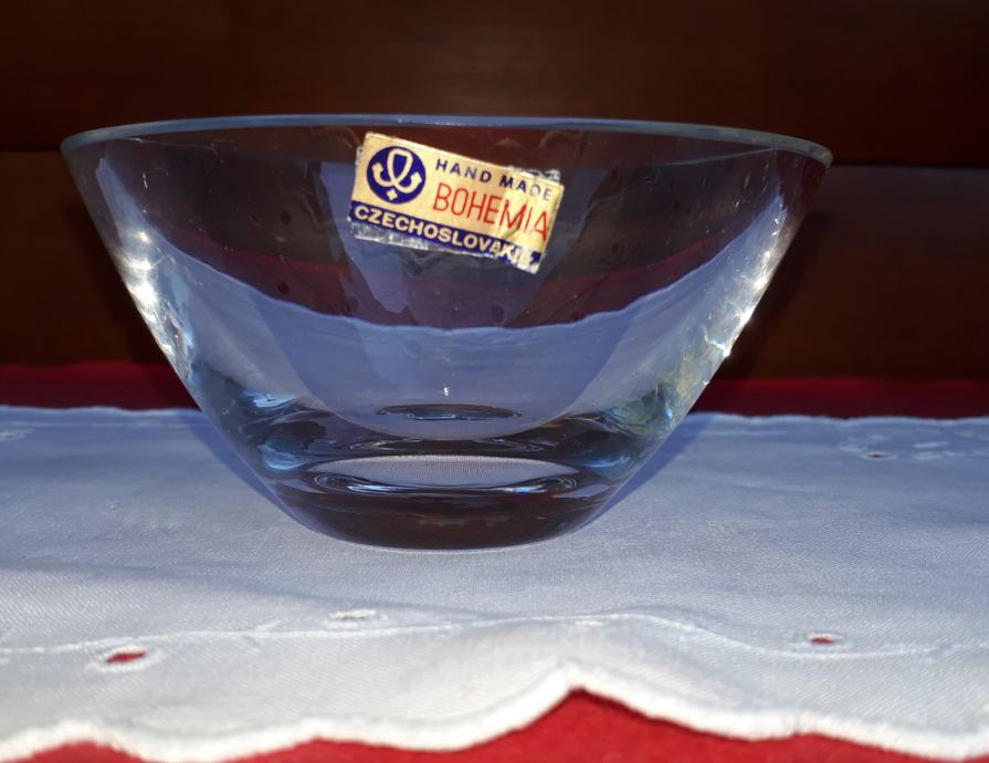 Skledica iz kristalnega stekla Bohemia, češkega porekla, premer 11 cm, višina 5,5 cm, uporabna za serviranje prigrizkov, suhega sadja, čokoladic. Zeli lepo ohranjens.