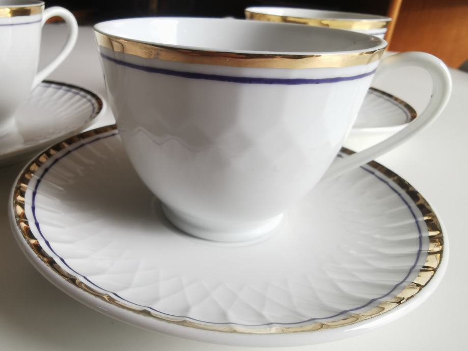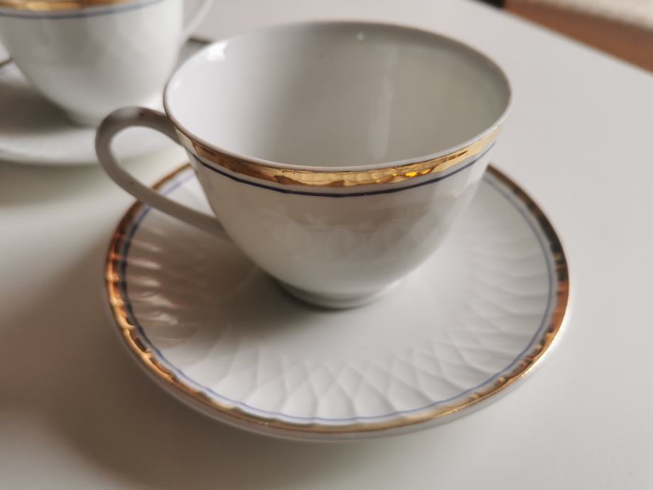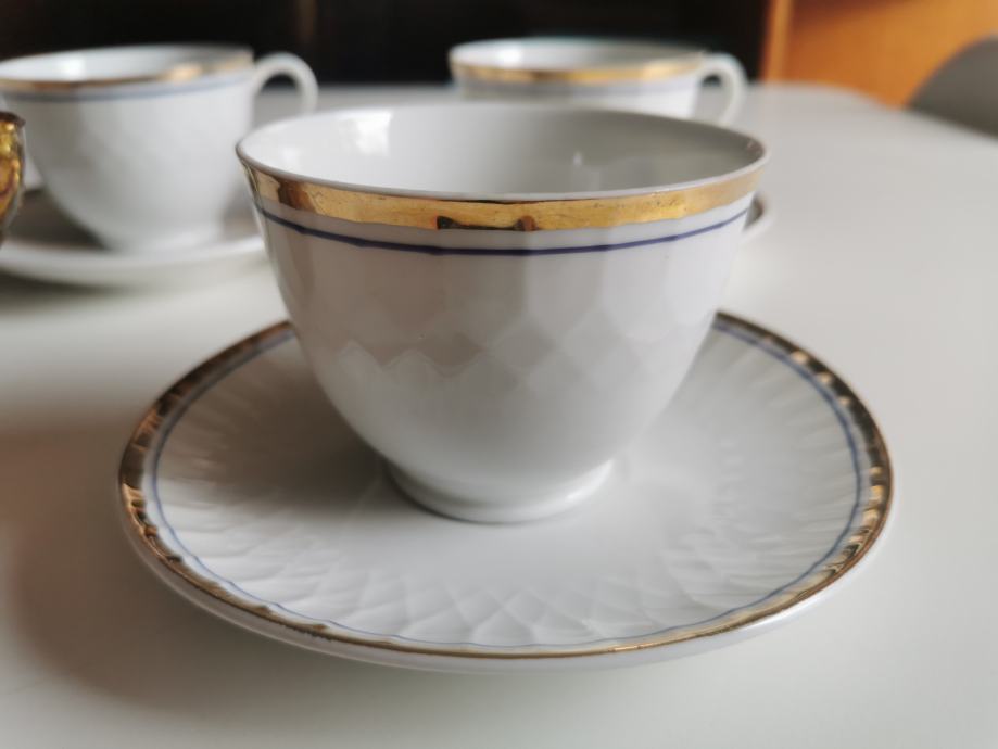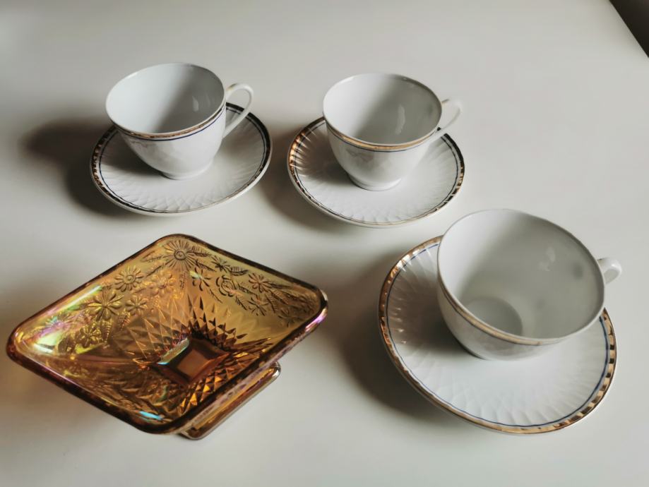 Komplet 3 kom skodelic (premer 9 cm) s pripadajočimi krožniki in zlata steklena desertna posodica.