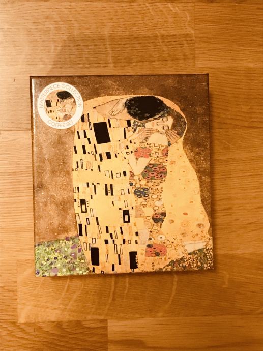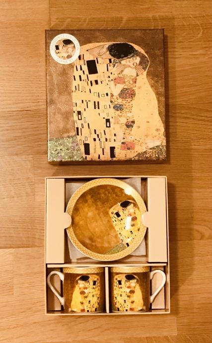 Prodam set 2x šalčka za kavo, 2x krožnik v darilni škatli, motiv Gustav Klimt: Poljub (The Kiss)