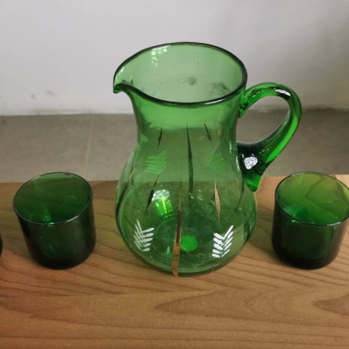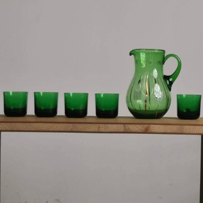 Lepo ohranjen set 5-ih zelenih kozarcev z vrčem.