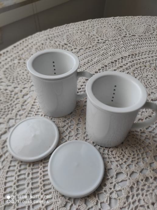Skodelici s cedilom in pokrovom, bel porcelan, viš. 10 cm,