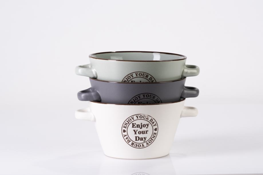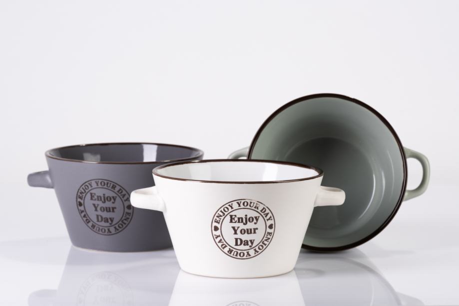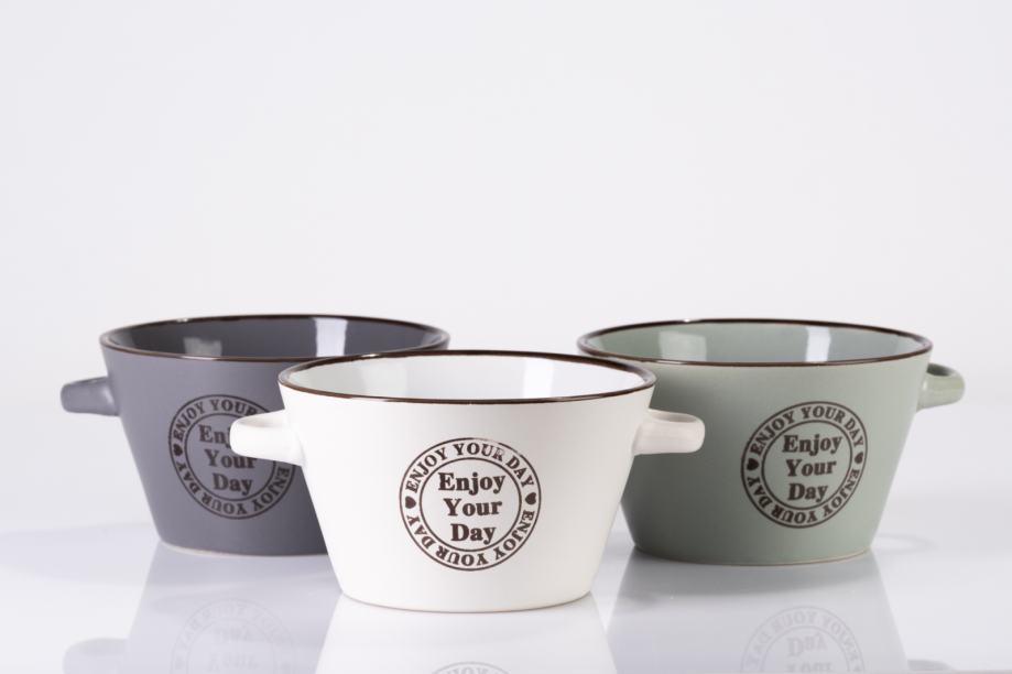 Elegantna keramična skodelica z udobnimi ročaji in dekorativnim napisom Enjoy Your Day. Primerna je za serviranje juh, solat, testenin ali kot okrasni element v kuhinji. Kakovostna izdelava zagotavlja trpežnost in dolgo obstojnost. Na voljo v različnih barvah (bela, siva, zelena) – barvo izberete po želji. Večji nakup prinese večji popust!