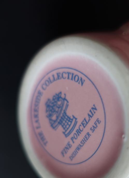 Nerabljena skodelica z vzročkom rožic in vrtnega orodja, znoraj roza barva.
