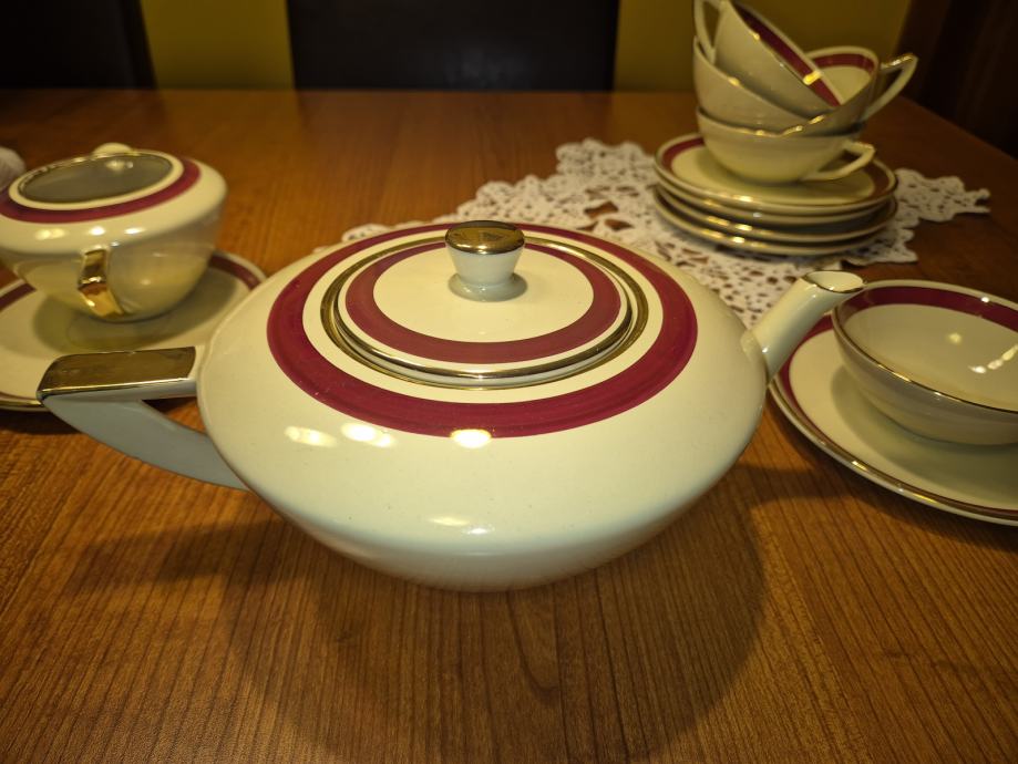 Vintage rabljeni čajni servis, 5 skodelic , 6 krožnikov, čajnik s pokrovom in skodelica za mleko brez pokrova,