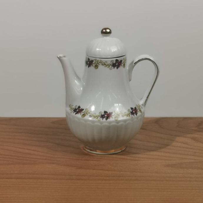 Lepo ohranjen vintage čajni set Zaječar, ki vključuje štiri skodelice s podstavki, čajnik, vrček za mleko in posodico za sladkor. Eleganten komplet s subtilnim cvetličnim vzorcem in zlatimi detajli je idealen za postrežbo čaja ali kave.
