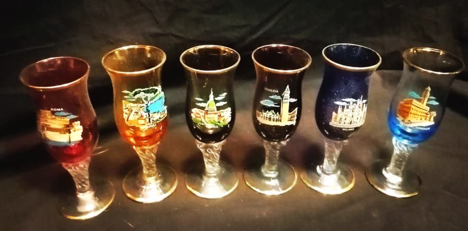 Prodam lepo ohranjene zelo stare vintage shot kozarce, Galliano, Italy iz barvnega stekla z zlatimi detajli. 4+6 kom.