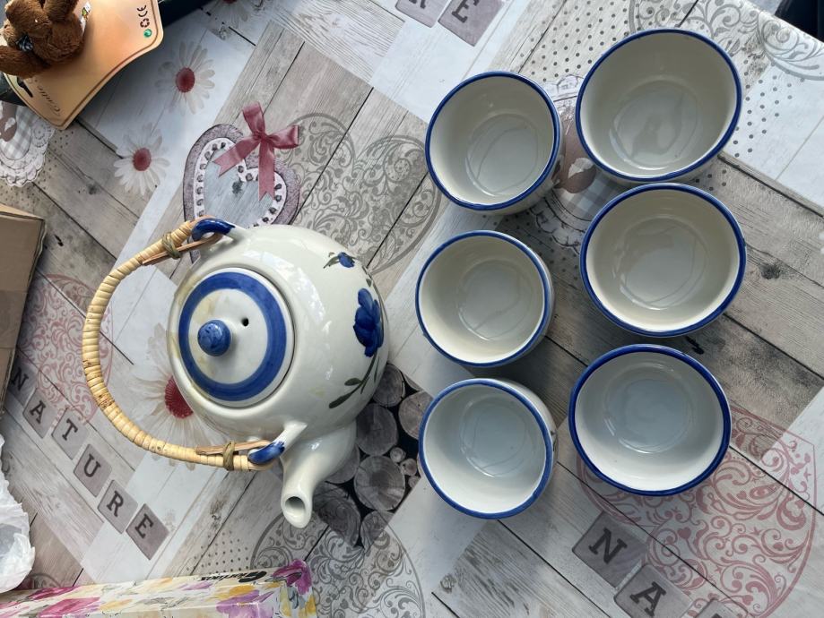 Vrč za približno 1 L čaja in 6 majhnih skodelic z ujemajočim motivom. Nikoli rabljeno, nepoškodovano. Keramika.