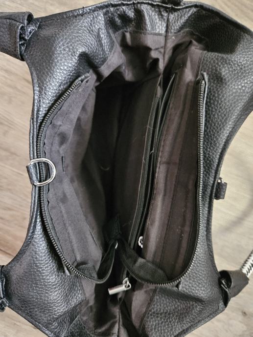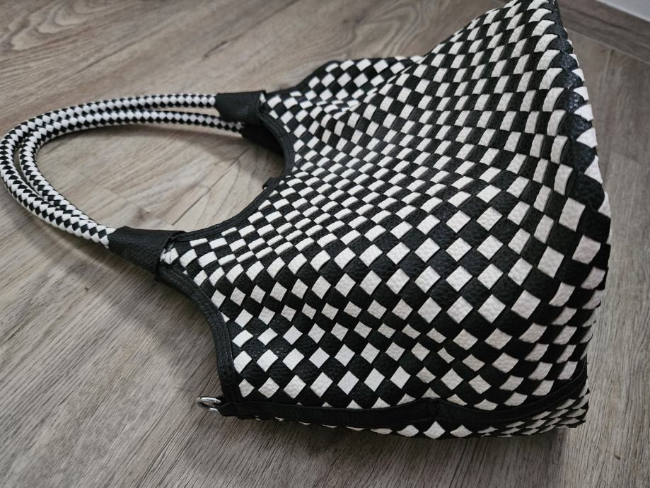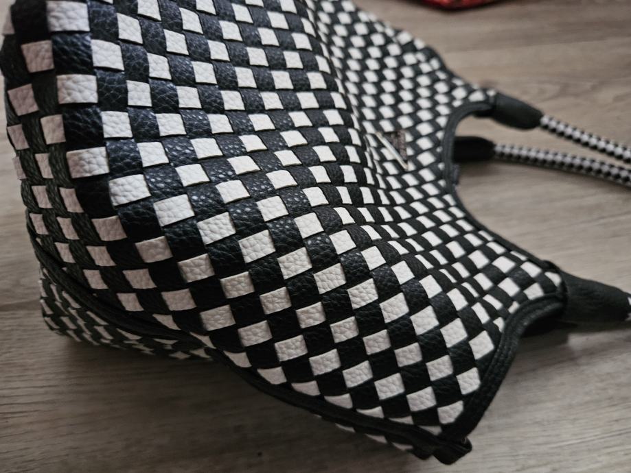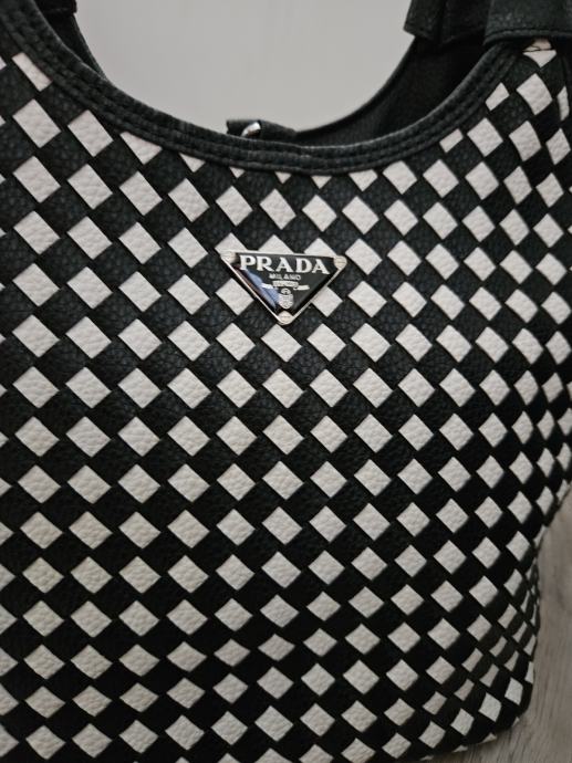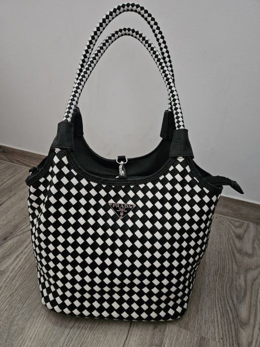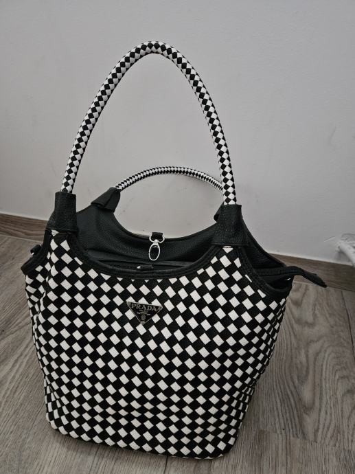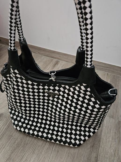 Nerabljena torbica Prada, črno bela z zadrgami in ročaji. Velikost cca 30x40