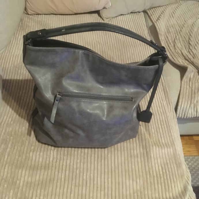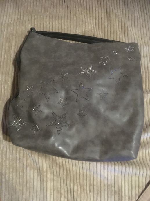 Prodam torbico sive barve, na sprednji strani kamenčki, ki pa so drobni in nevpadljivi, v visino meri 36cm, sirina 34, je enoprostorna, v notranjosti je predal z zadrgo in se predal za mobitel, cena 7€' kličite 040858990