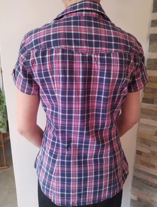 Lahka telirana bluzica s karo vzorcem, v temno modri, rdeči in beli barvi, s prsnimi žepi, material: 100 % bombaž, znamka Logg (H&M), velikost 36, dolžina 61 cm, širina čez prsa 44 cm, v pasu 40 cm, čez boke 47 cm.