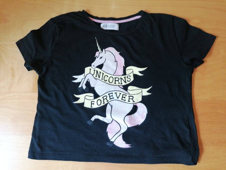 Crop top H&M, št. 134/140 v črni barvi s sličico samoroga. Dolžina majice je 38 cm, od pazduhe do spodnjega roba pa 22 cm.
