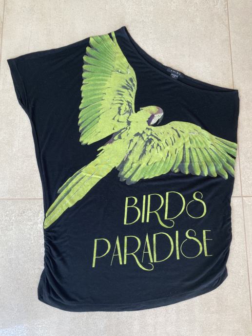 Prodam čudovito MAJICO, znamke Amisu, v črni barvi z zeleno papigo in napisom BIRDS PARADISE na prvi strani, v lepem in malce drugačnem modnem kroju s postrani izrezom. Velikost: XS - kot NOVA.