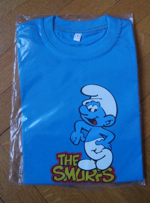 Še nova, zapakirana majica modre barve z aplikacijo Smrkca.