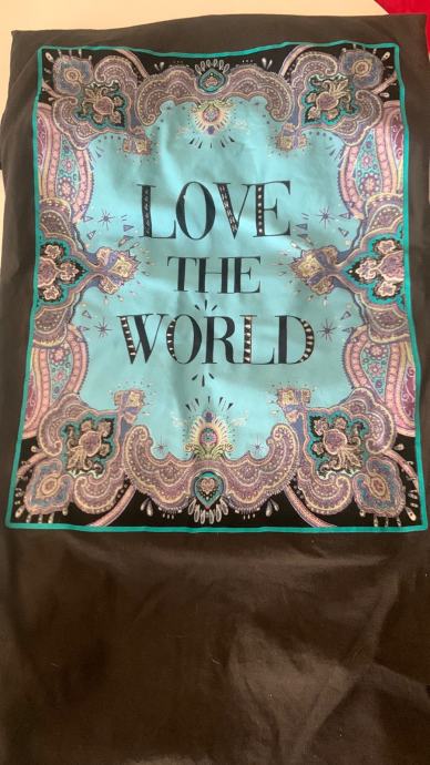 Majica je regular cut model- torej ni telirana in je velikostne številke XL. Super izgleda tudi kot oversize majica. Material je 100% bombaž.