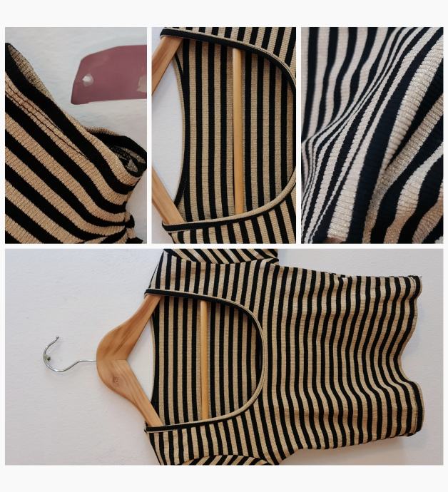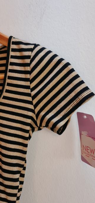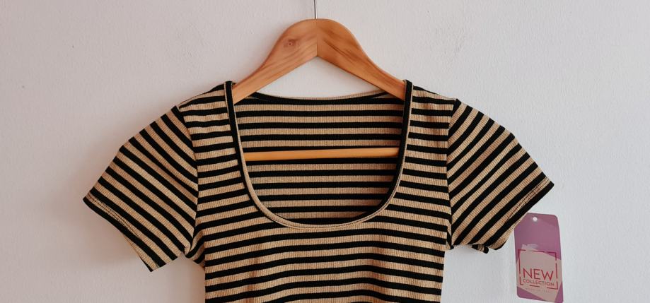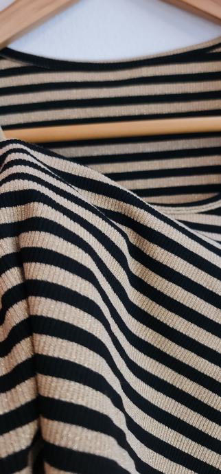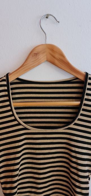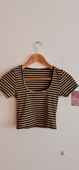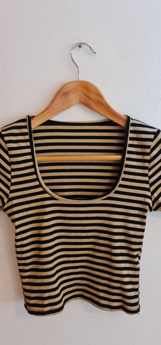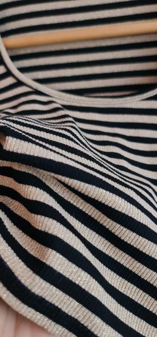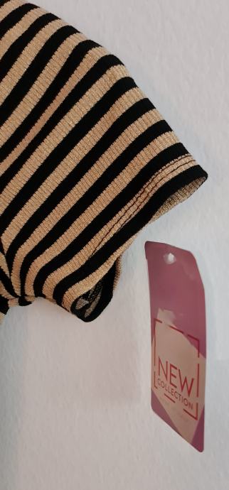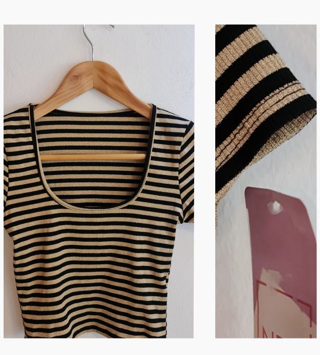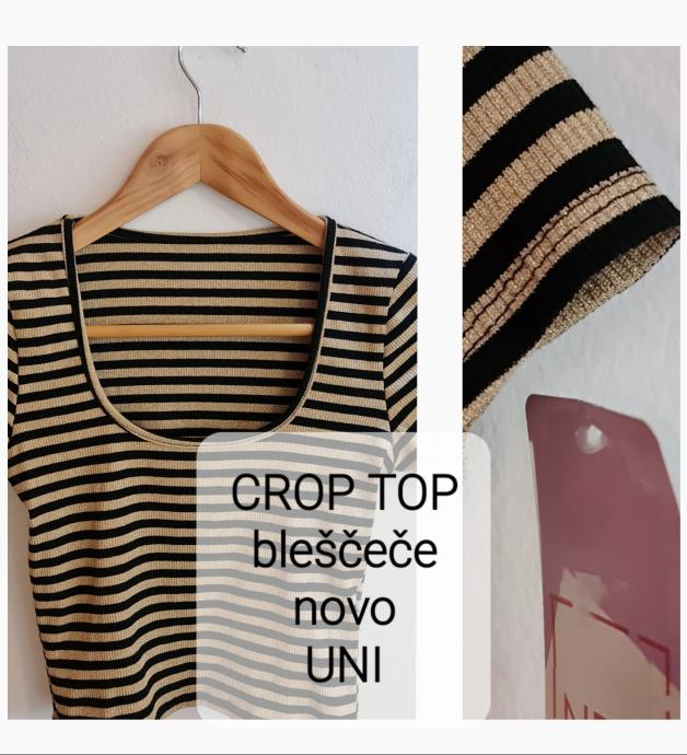 Lep, bleščeč crop top v črno/zlati barvni kombinaciji. Novo, z etiketo. Velikost - uni (za 36-40). Zelo raztegljivo - 20% elastana.