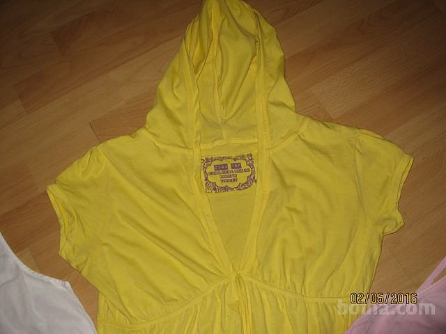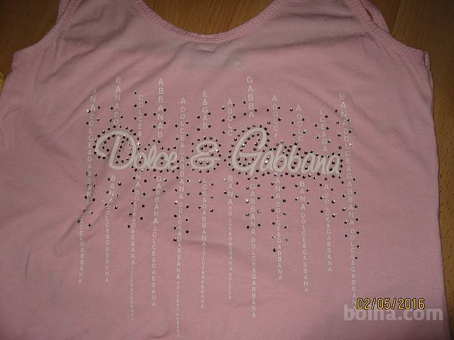 Prodam odlično ohranjen komplet ženskih majic številka 38: 1x roza majčka z bleščicami in napisom Dolce&Gabbana, 1x rumena s kapuco znamke Zara, in bela vintage bombažna majčka z vezenino. Vse izgleda kot novo, je iz kvalitetnih materialov in modno. Cena je pravzaprav samo za DG majico, ostali dve sta gratis. Cena je ugodna 17,00 eur + 4,00 eur navadne ptt ob predhodnem nakazilu na trr.