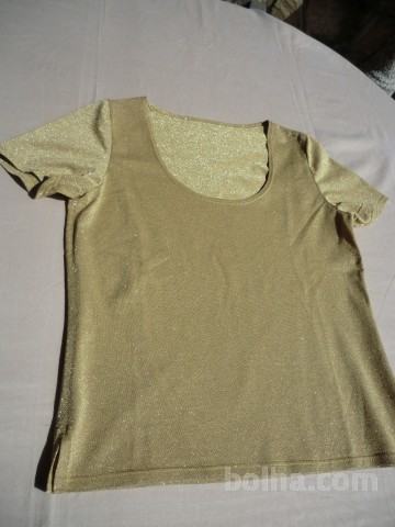 Prodam unikatno zašito majčko iz zlatega lurexa vel.40-42-kratek rokav.Dolžina 62cm, širina ramen=39cm, prsni obseg=96cm,širina bokov 96cm. Na obeh straneh ima razpoke.Nosimo jo lahko tudi pod jakno,jopico,reklcem...svečan vtis.V resnici še bolj zlata kot na sliki.Pošljem "po povzetju"