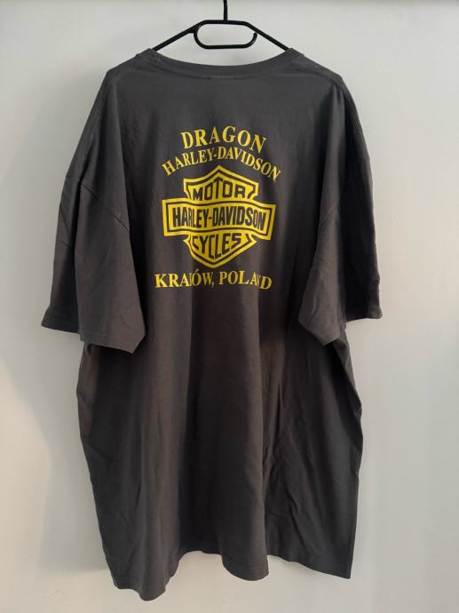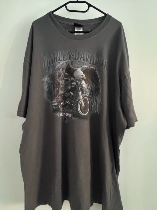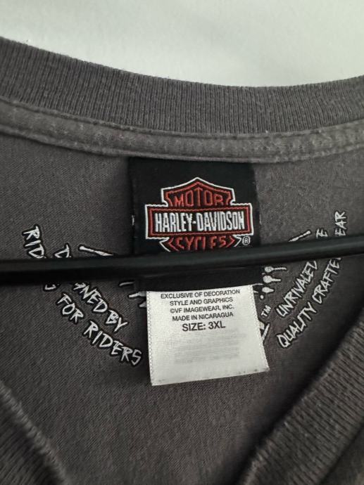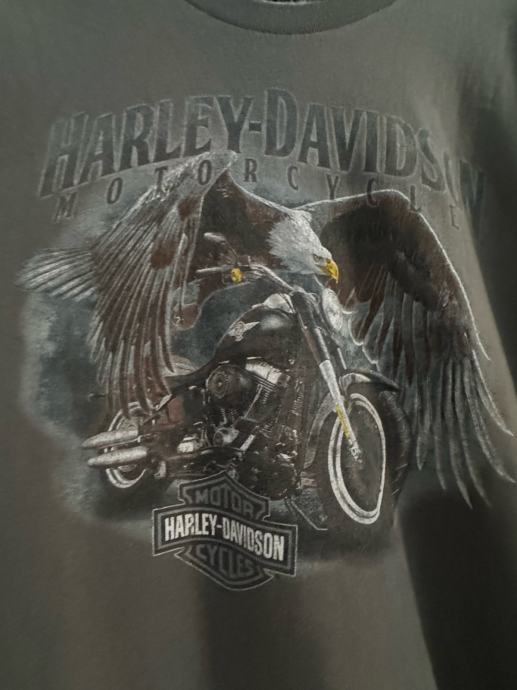 Prodam Harley Davidson majico v velikosti 3XL s prepoznavnim motivom orla in motorja. Majica je temno sive barve z značilnim Harley Davidson logotipom in detajli na sprednji in zadnji strani.
