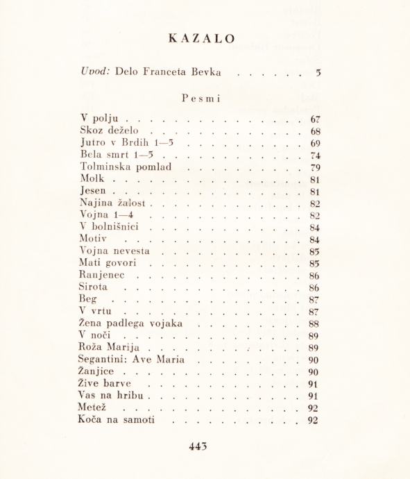 Prva knjiga: Pesmi, Krajša proza. Knjiga je opremljena s posvetilom predsednika vlade RS za blagovni promet, 1952