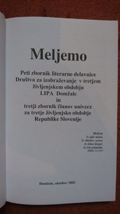Meljemo. 5. zbornik literarne delavnice Društva za izobraževanje v 3ŽO LIPA Domžale in 3. zbornik članov univerze za 3ŽO RS, 2002
