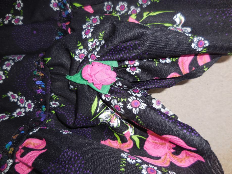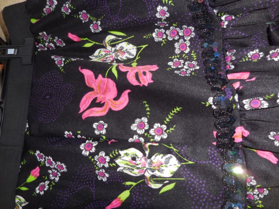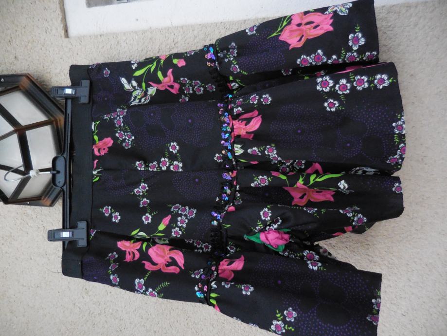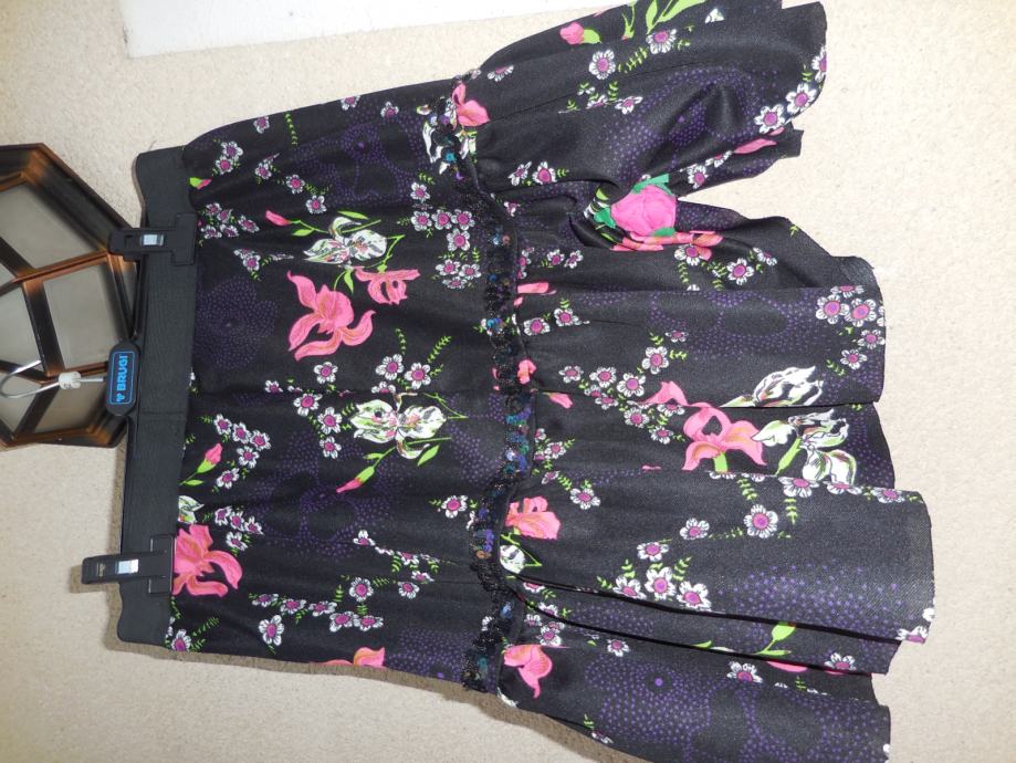 Zelo lepo ohranjeno, skoraj nenošeno kratko črno cvetlično krilo. V pasu ima 4cm široko elastiko, tako da je primerno od 38 do 42. Krilo ni podloženo in je delno raztegljivo. Na spodnji strani ima spredaj in zadaj prišito okrasno rožo.