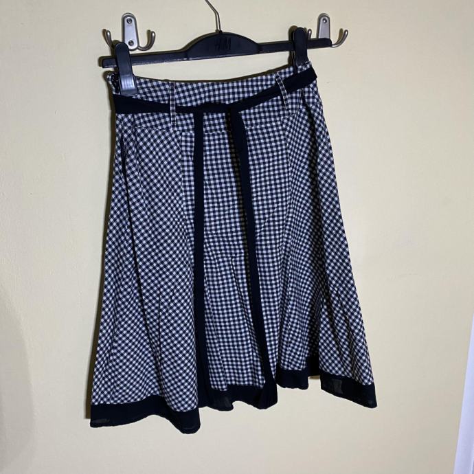 Črno-belo krilo s karirastim vzorcem in črnim pasom, z visokim pasom. Material je lahkoten.