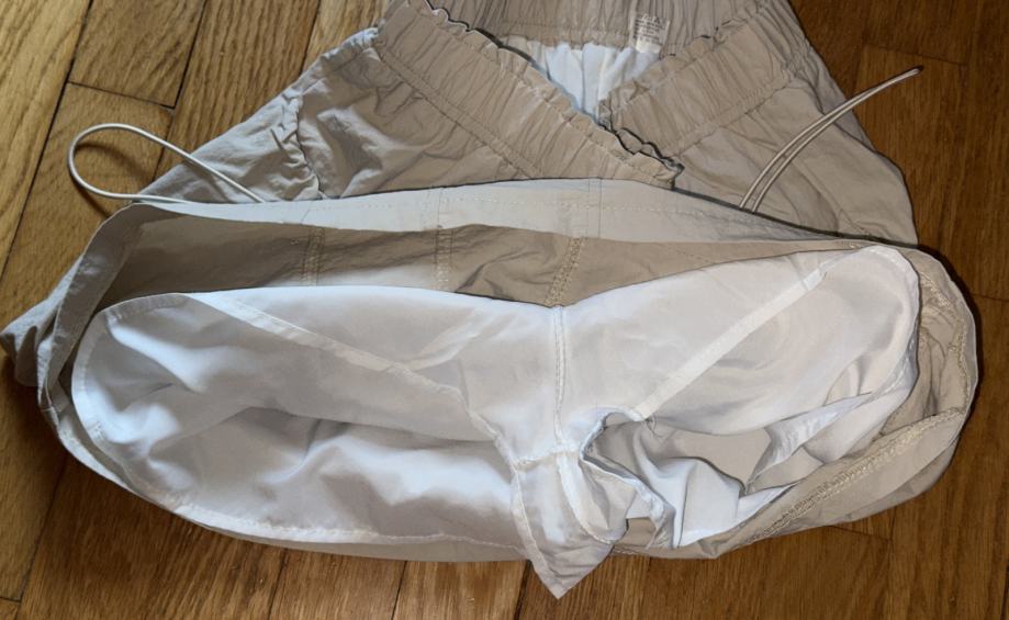 Kratko bež krilo z elastičnim pasom, žepi in tankimi belimi hlačami pod krilom.