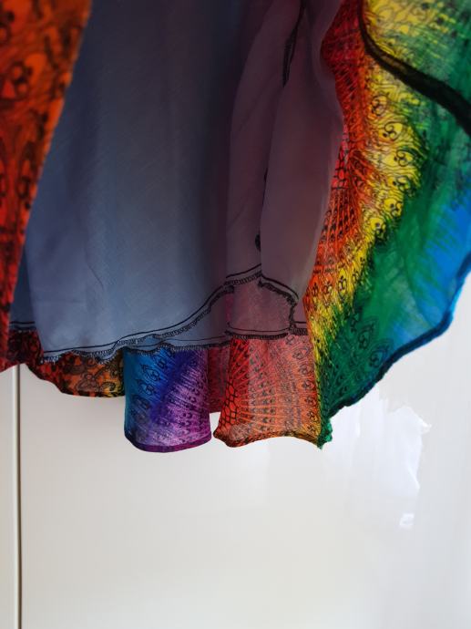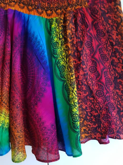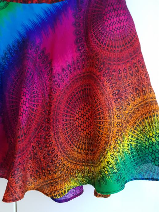 Novo, bombažno, mini, podloženo s tanjšo podlogi. V pasu ima na zadnji strani pošito elastiko in meri 35 do cca 40cm, dolžina je 53cm. Ne menjam, ptt ni vključena v ceno
