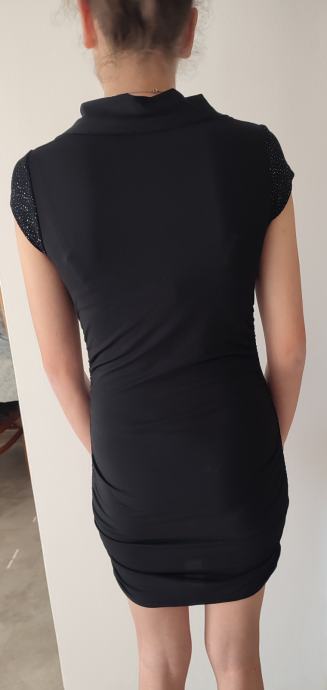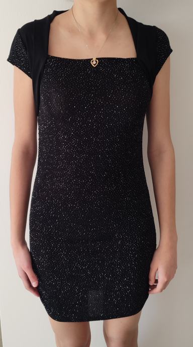 Črno oprijeta obleka z bleščicami. Velikost S. Dolžina 90 cm. Material: 92 % bombaž, 8 % elastan. Raztegljivo.