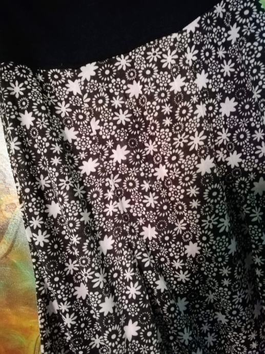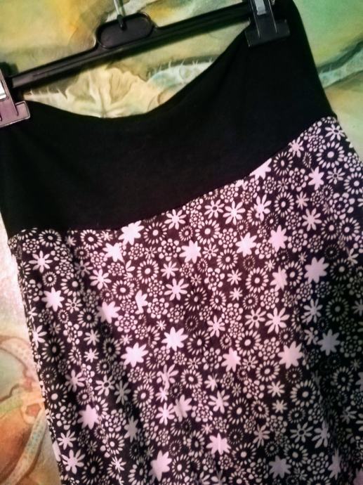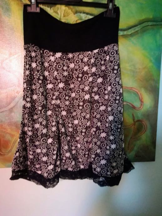 Prijetno poletno krilo, mehek padajoč material, prijeten debelejši pas, spodaj nevpadljiva čipka, L do XL velikost , dolžina okoli 60 cm (jo uravnavamo s pasom).