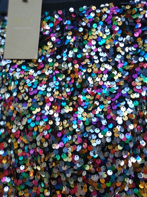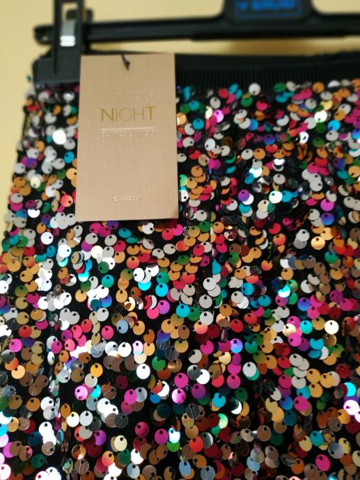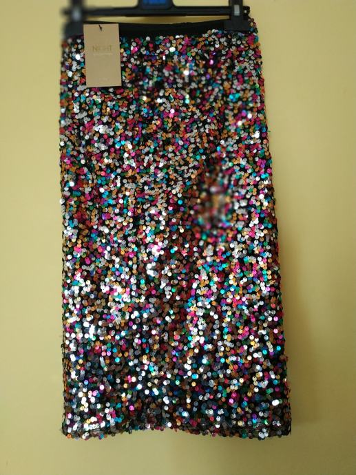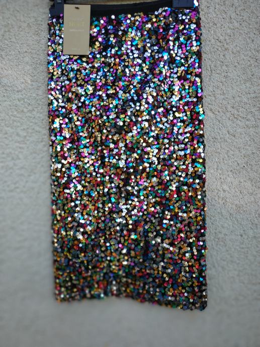 Novo z etiketo, podloženo, raztegljivo, v pasu ima elastiko in meri od 29 do 35cm, dolžina je 65cm, PTT ni vključena v ceno