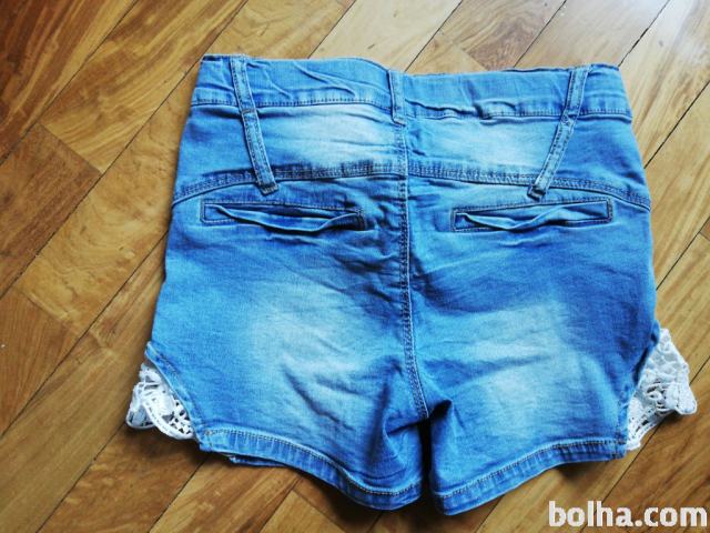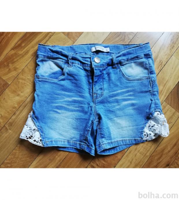 Prodam zelo lepo ohranjene dekliške jeans kratke hlače, ki jih krasijo bele čipke. Jeans je raztegljiv, znamka Name it, velikost 140.
