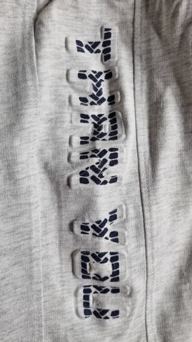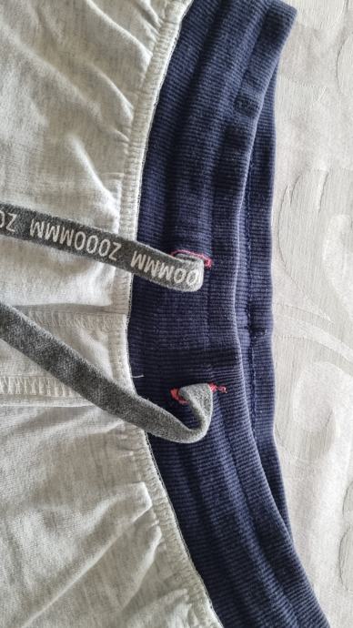 So svetlo sive barve, iz 100% bombaža, zelo kompaktnega, so zelo dobro ohranjene. Nosil jih je samo en otrok. V pasu je elastika, širina pasu pa se da tudi regulirati z trakcem.