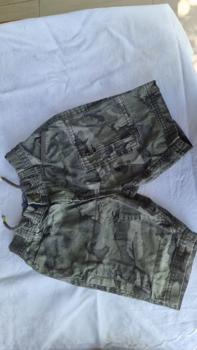 Matrial je 100% bombaž. Model je športni. Spredaj sta ob strani dva notranja žepa in en malo nižje na stegnu, ki se zapenja z zadrgo. Zadaj sta še dva zunanja žepa, ki se zapenjata z netom.V pasu se dajo regulirati s trakcem