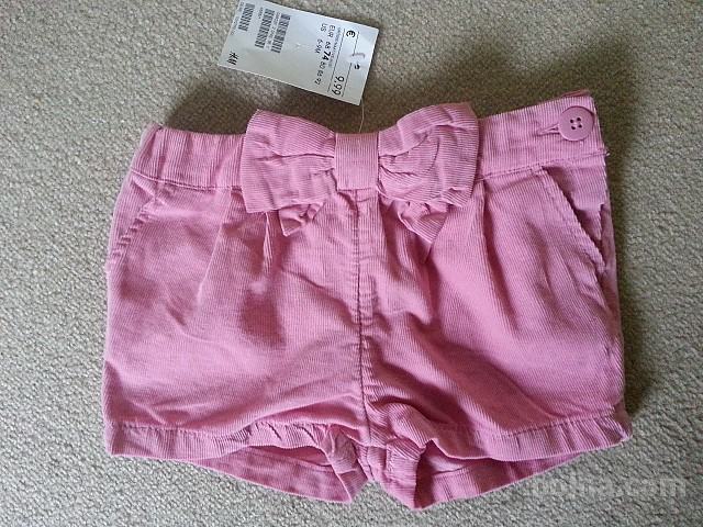 Nove kratke hlače H&M 74, brušen žamet v lepi roza barvi z mašnjico...regulacija v pasu...nosljive tudi pri 80....cena je 7,50€..