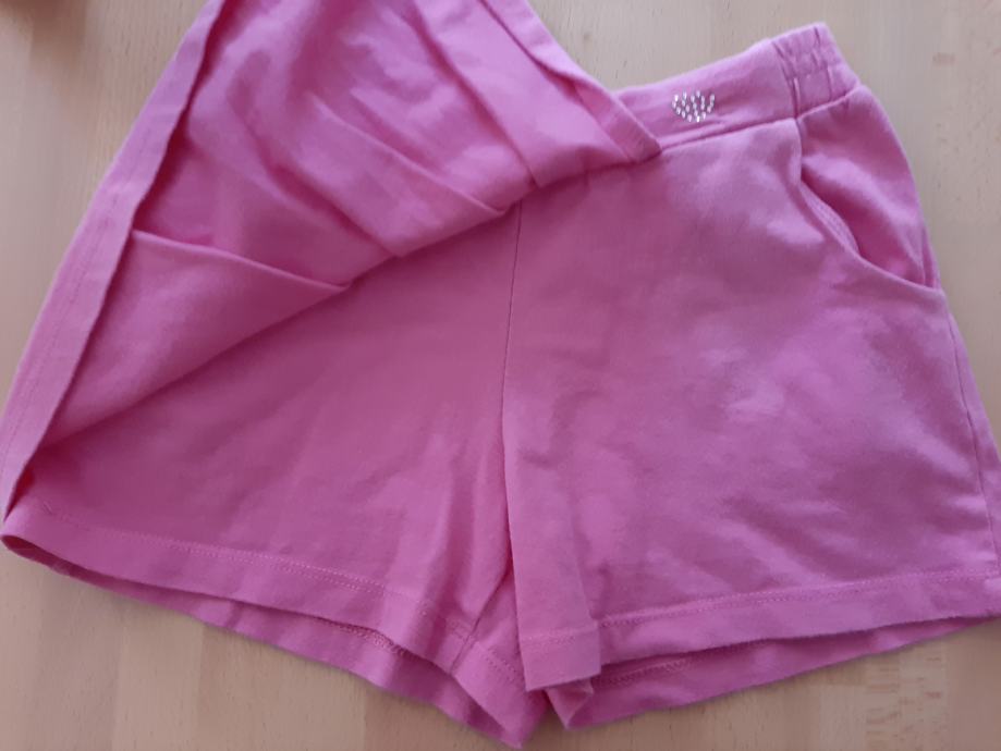 3x oblečene kratke hlače, ki od spredaj zgledajo kot krilo. Imajo dva žepa, v pasu elastiko. Na njih piše velikost 4-5 let, ampak je verjetno napaka. So precej večje in v pasu so bolj široke. Dolžina: cca 22-24 cm. Mehke, bombažne, udobne, rahlo elastične.