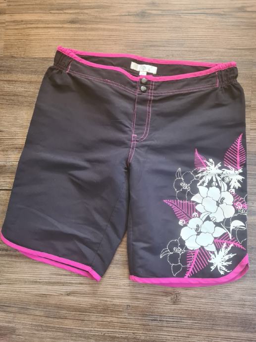 Kratke hlače, nekoliko daljše, do nad koleni. Črne barve z pink črtami. Tanek material. Velikost 36.