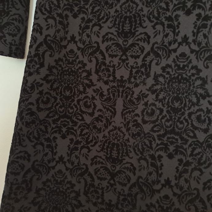 Ženska obleka, črna, žametni vzorec, rahlo raztegljiva, tričetrt rokavi, malo večji izrez, zadaj zadrga, ni znakov nošenja. Zeli lepa, telirana.