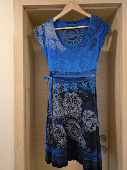Zelo lepo ohranjena obleka original Desigual s modrim trakcem ob pasu, velikost 40 (ampak je ok tudi za 38). Nošena zelo malo zaradi prevelike številke. Kvalitetna izdelava. 100% bombaž. Skrbno shranjena, brez deformacij.